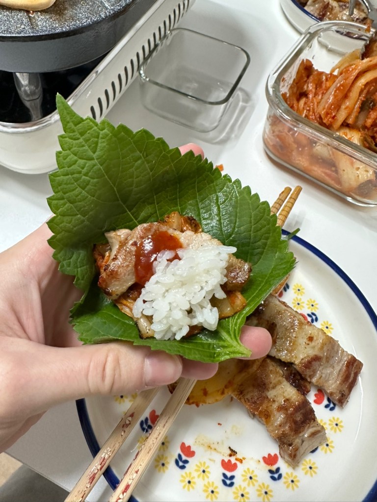 Then, you should put everything you like into a ssam, such as the perilla leaves, picked radish or the lettuce. I like everything, so I put in the kimchi, meat, ssamjang, and rice.