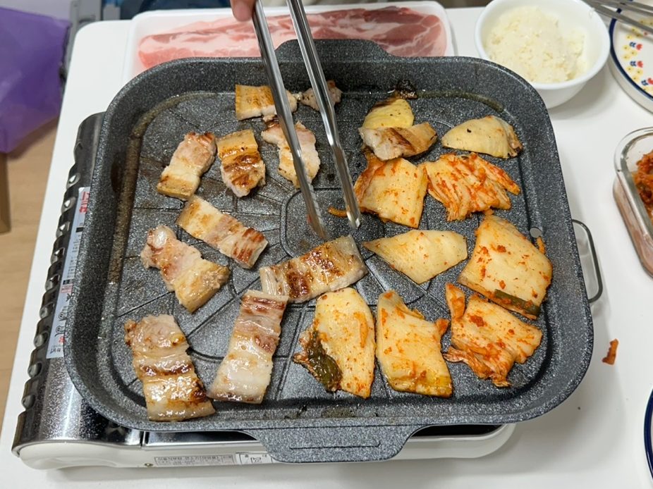 Laying down the samgyeopsal on the hot pan… Make sure to open the windows, because it should make a lot of smoke. And make sure to put a paper cup or something below the hole where the oil is drained.