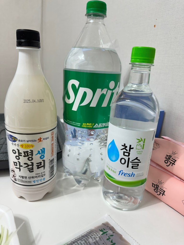 So I tried mixing together maekgolli, sprite, and soju to make a mixed drink called 막소사 (maksosa). Named so because its just maekgolli, soju, and saida (cider/sprite).